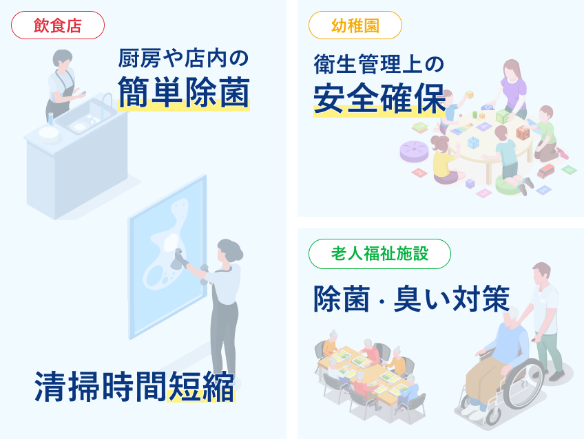 アルカリ性・酸性両方の電解水を生成できるので、多様な施設で清潔な環境作りをお手伝いいたします。